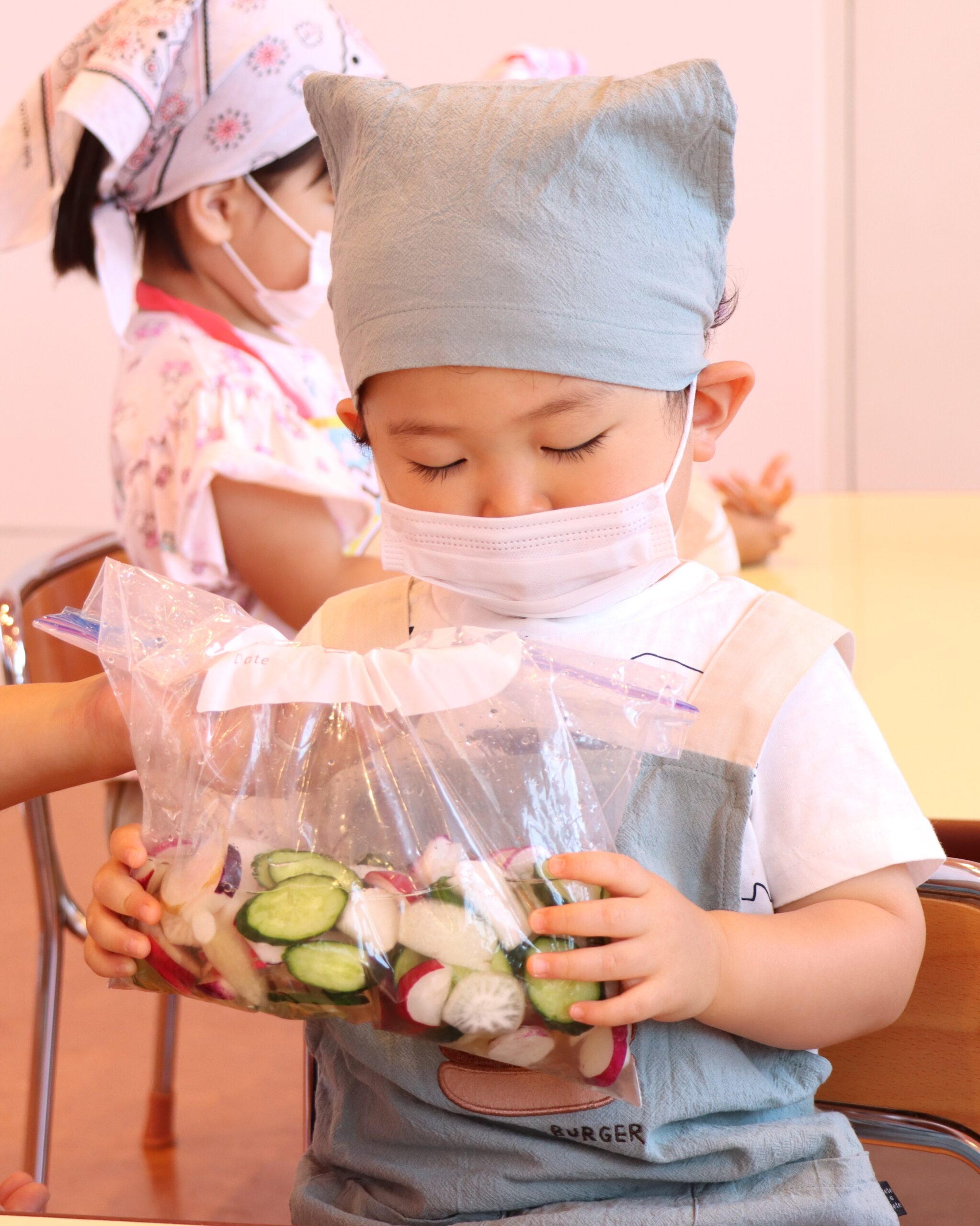 菜園活動で各年齢に応じて育てた食材を給食として子どもたちが調理します。自ら育てた食材を調理して食べる子どもたちは、好き嫌いが減り心身ともに丈夫な体になります。また、命ある食材を大切にし、感謝して食事ができる子どもに成長します。その他、行事食作りなど、日常の保育でもクッキングを実施しています。