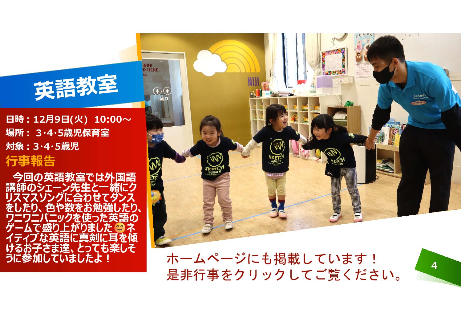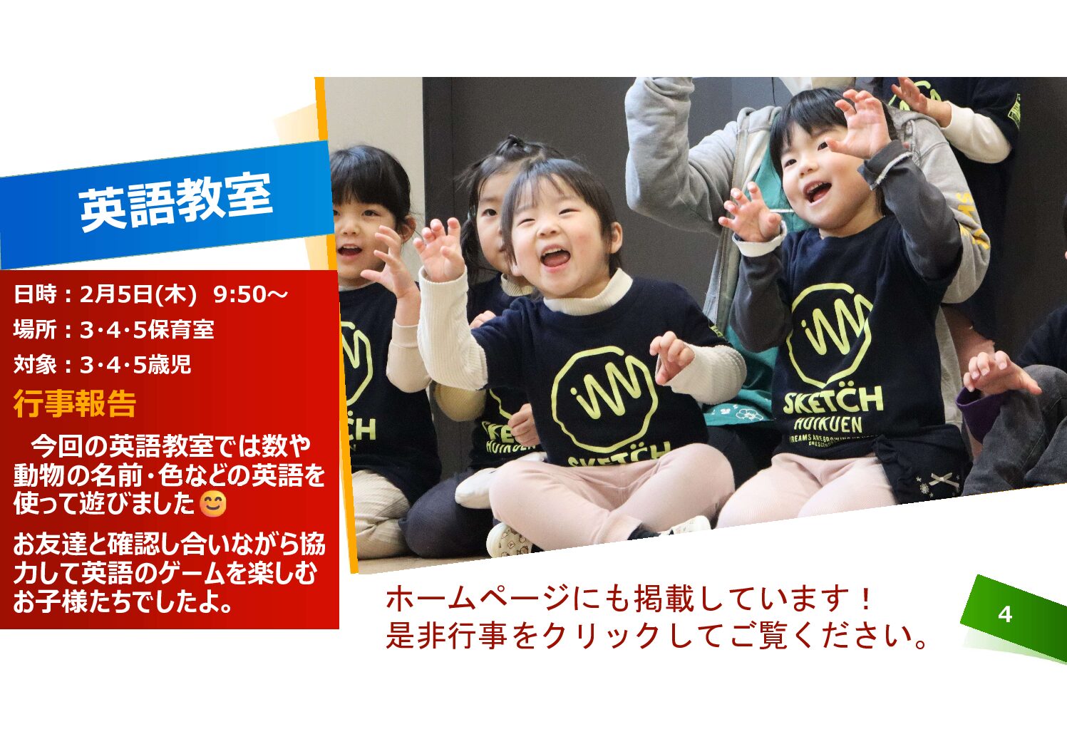 行事 園の紹介ABOUT 保育内容CHILDCARE 行事EVENTS 食事LUNCH サービス向上SERVICE お問い合わせRECRUIT EVENTS行事 みんなの「言葉」で、みんなに「言葉」で伝えよう。おもしろいよ、楽しいよ。スケッチの時間はいつもみんなの声とともに。 年間行事 4 APR 5 MAY 6 JUN 7 JUL 8 AUG 9 SEP 10 OCT 11 NOV 12 DEC 1 JAN 2 FEB 3 MAR 毎月の行事 誕生会 避難訓練 健診(内科・歯科)年2回
